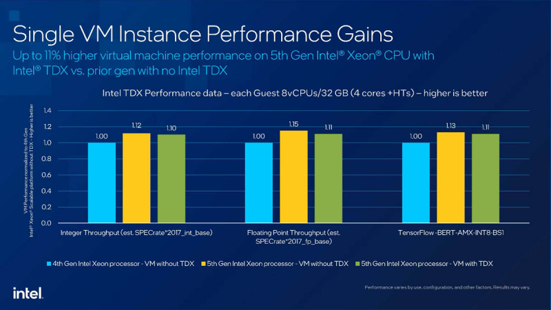 Uma das inovações bastante importantes no Emerald Rapids é o suporte de hardware para TDX (Trust Domain Extensions). Na verdade, este é um novo modo de operação do processador, o chamado. SEAM (Secure Arbitration Mode), no qual a máquina virtual pode ser completamente isolada de tudo o que acontece fora do domínio confiável. A criptografia do conteúdo da memória de tal domínio é realizada em hardware, portanto a penalidade de desempenho é mínima e o desempenho final da VM ainda é maior do que em processadores sem suporte TDX.