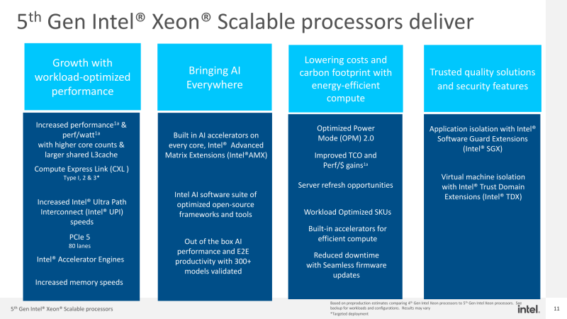 Um dos principais objetivos do Emerald Rapids é uma fácil atualização dos sistemas existentes baseados em Sapphire Rapids, permitindo um aumento significativo no desempenho a um custo relativamente baixo, bem como uma redução no TCO ao atualizar infraestruturas da terceira e anteriores gerações de Xeon escalável. A Intel está promovendo ativamente o conceito de aceleradores, citando números que comparam o custo de propriedade de infraestruturas baseadas em Xeon Scalable de primeira, terceira e quinta gerações, tanto na implantação quanto na atualização.