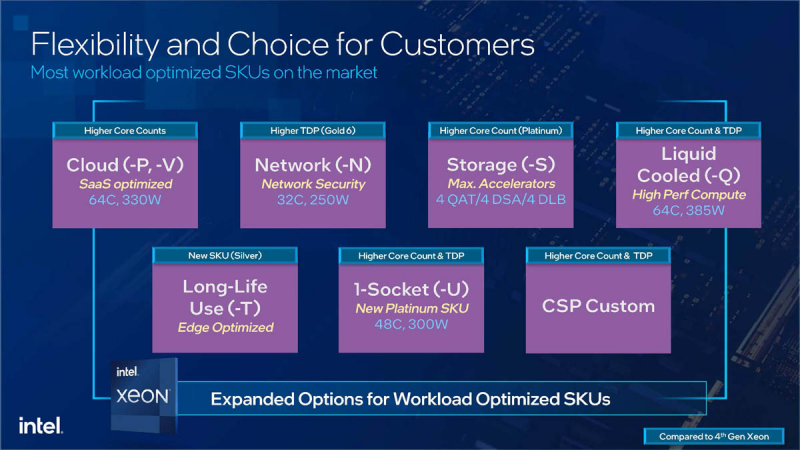 Existem pequenas alterações no esquema de nomenclatura da CPU – o Emerald Rapids recebeu um sistema de sufixos bastante harmonioso que descreve o escopo principal de um processador específico. Quanto ao pacote térmico, seu escopo é limitado principalmente a 350 W. Apenas um modelo, o Xeon Platinum 8593Q, ou seja, uma versão de 64 núcleos com frequência turbo de 3,0 GHz para todos os núcleos, destinada a funcionar em conjunto com um sistema de suporte de vida, possui TDP base de 385 W.