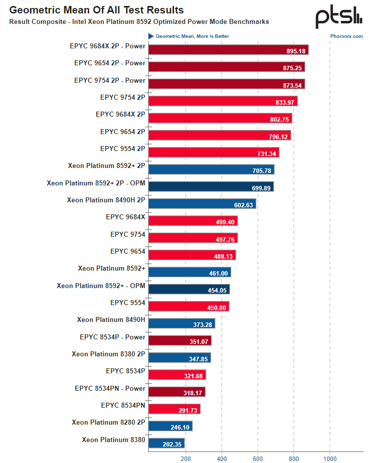 Também foi registrado um ganho de eficiência, embora não tão significativo quanto a Intel promete. A verificação do novo Modo de energia otimizado no BIOS mostrou que este modo não é usado por padrão, e ativá-lo realmente permite reduzir seriamente o consumo de energia do Emerald Rapids nos modos de carga média e leve. Isto proporciona um desempenho geral de 93% daquele alcançado com a otimização de energia desativada, embora os resultados variem muito dependendo da natureza da carga de trabalho específica.