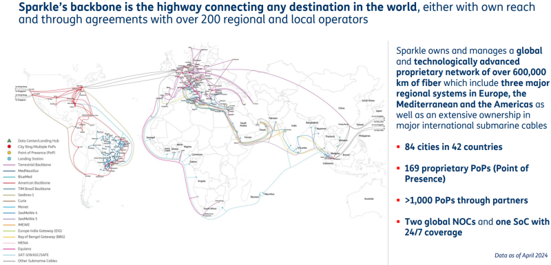 Hoje a empresa administra mais de 600 mil km de cabos conectando os países da Europa e da América. O governo italiano procura agora tornar a Sparkle propriedade pública como parte de um plano para obter o controlo de activos estratégicos. Não muito tempo atrás, a França fez praticamente a mesma coisa, comprando a Alcatel Submarine Networks da Nokia. O Ministério da Economia e Finanças italiano (MEF) e a Retelit, uma empresa controlada pelo fundo Asterion, ofereceram 700 milhões de euros (724 milhões de dólares) pela Sparkle, informa a DataCenter Dynamics.