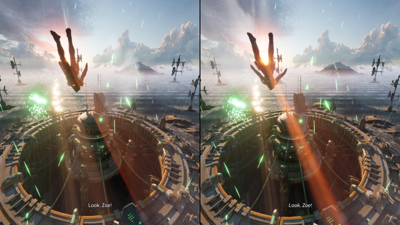 O som de Split Fiction faz você sentir empatia pelo que está acontecendo na tela a cada segundo – tanto na seção de ação cheia de explosões, barulho de metal e tiros ensurdecedores, quanto no jogo de ritmo acelerado com o rei macaco.
