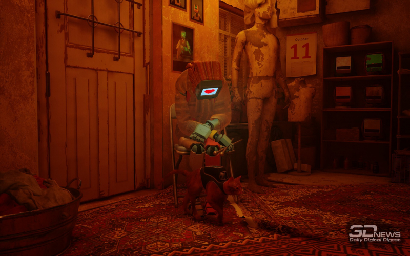 Por exemplo, há um botão especial para miar e de maneiras diferentes (não podemos configurá-lo ainda) – no começo ajuda a encontrar uma maneira, o mundo reage aos sons feitos pelo gato. Então podemos apenas miar de prazer. Isso, no entanto, não é surpreendente – sem sentido, mas trabalhando na atmosfera, as ações pressionando uma tecla especial não são tão raras: lembre-se do mugido de Red do Transistor ou abraços no Spiritfarer. Mas Stray tem um arsenal muito mais rico: podemos afiar nossas garras em uma variedade de objetos (geralmente tapetes e móveis de madeira), esfregar nas pernas ou deitar no peito dos robôs, invariavelmente tocá-los, ficar sob os pés, adormecer docemente em lugares aconchegantes e, claro, largar itens. E isso não é tudo – no caminho encontraremos caixas nas quais você precisa pular, um piano no qual você pode “tocar”, sacos de papel, que pode ser colocado na cabeça, perdendo a orientação no espaço, e assim por diante. Neste ponto, todo fã de gatos pode parar de ler e comprar Stray.
