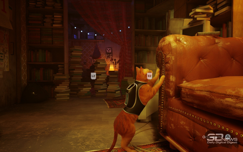 Bem, não se pode deixar de dizer sobre o tato do Stray – você precisa jogá-lo com um gamepad com feedback de vibração. Por exemplo, conectei um DualShock ao meu PC – e mesmo isso é mais do que suficiente para sentir como o gato ronrona, como fica assustado e como seu pelo se esfrega. Em um PlayStation com DualSense, ouso dizer que o efeito é ainda mais poderoso.
