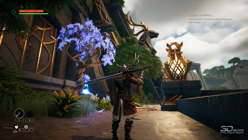 Na primeira hora, sem nenhum contexto, vagamos por belas, mas típicas florestas e ruínas. Em tal situação, ficamos apenas com batalhas, e nas batalhas há um problema. Pode parecer que este é outro clone típico de Dark Souls. Nominalmente, todos os sinais estão no rosto: golpes fracos e fortes no local; parry – sim; a menos que não haja nenhum bloco, mas tudo bem. O principal é que seja fornecida uma cambalhota (bem, formalmente é um rebote, mas não o ponto), o que significa – “wort”. Mas não caia na armadilha.