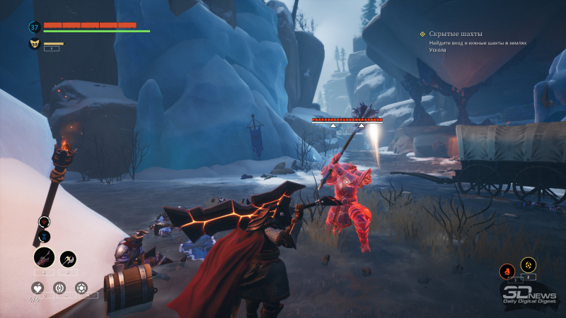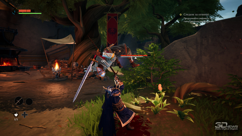 As batalhas são construídas em contra-ataques e esquivas. E não, também não é Sekiro. Antes de um ataque, o inimigo é destacado em uma determinada cor. Se for vermelho – você precisa desviar do golpe, e se for azul – você deve desviar. A luz de fundo dispara cedo, mas o movimento defensivo deve ser feito um momento antes de Farren levar um soco no rosto. Se for bem-sucedido, o herói não apenas evitará danos, mas também restaurará instantaneamente parte de sua resistência. E um parry perfeito também interromperá o combo do inimigo, atordoando-o por um momento.