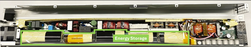 Capacitores eletrolíticos proporcionam consumo de energia uniforme diretamente no rack. Eles ocupam quase metade do volume da fonte de alimentação e fornecem 65 joules de armazenamento de energia para cada acelerador. O armazenamento (capacitor) é carregado quando o acelerador consome pouca energia e descarrega quando consome muita energia. Esse tipo de buffer ajuda a reduzir as flutuações no consumo de energia, o que foi demonstrado em testes comparativos do GB200 e do GB300 sob a mesma carga. O GB300 reduz a carga de pico na rede em 30%, enquanto fornece energia semelhante para os aceleradores.