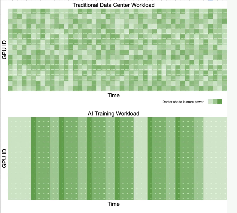 Durante o treinamento de modelos de IA, milhares de aceleradores trabalham em sincronia e realizam os mesmos cálculos em dados diferentes. Essa sincronização leva a flutuações de energia na rede — quedas de tensão ou excesso de energia durante períodos de inatividade repentinos, diferentemente das cargas de trabalho tradicionais de data center, onde os aceleradores trabalham de forma assíncrona e tarefas não correlacionadas “suavizam” a carga. A Meta✴ até precisou adicionar a opção PYTORCH_NO_POWERPLANT_BLOWUP ao PyTorch como medida temporária, o que sobrecarrega os aceleradores com trabalho sem sentido durante momentos ociosos.