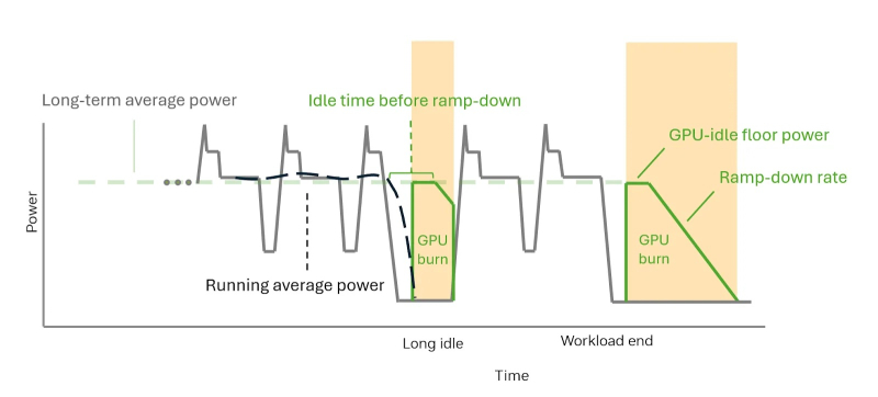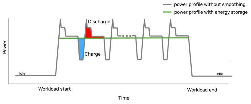 O GB300 limita os picos de energia aumentando o consumo de energia do acelerador de forma incremental. O limite de energia aumenta gradualmente, de acordo com a capacidade da rede. Quando a tarefa é concluída, o driver de software que implementa o algoritmo de suavização do consumo de energia ativa a redução de energia do hardware. O acelerador continua consumindo energia constante graças à função NVIDIA GPU Burn, aguardando a retomada da carga.