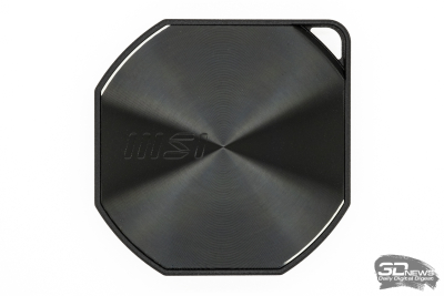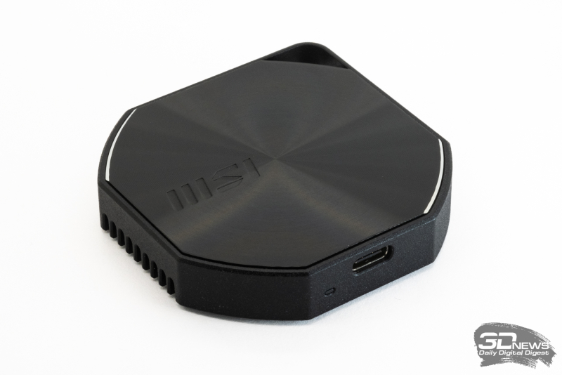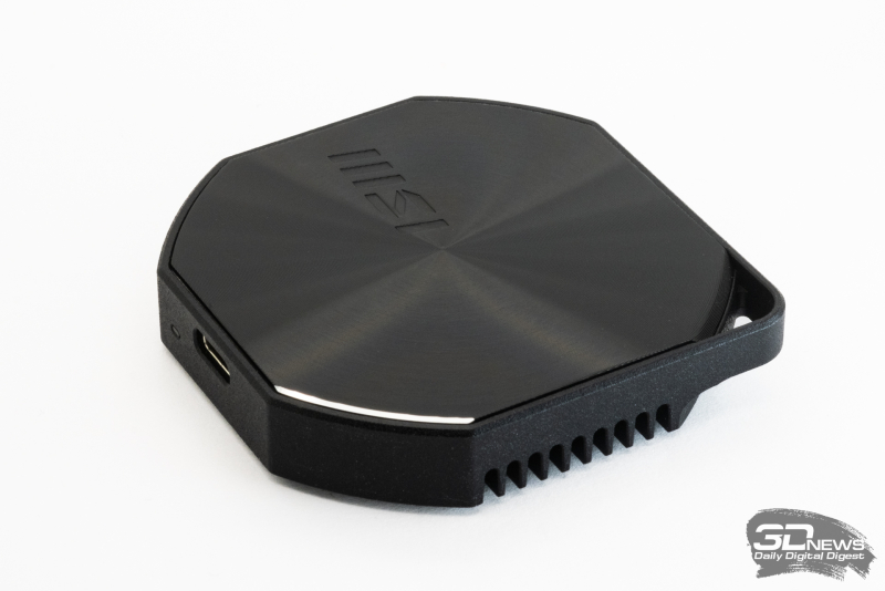 Como um SSD externo é um dispositivo que viaja com o usuário e é visto com bastante frequência, o design é de grande importância. A MSI escolheu um formato de prisma quadrado para o Datamag 20Gbps, com comprimento lateral de 66 mm e altura de 13 mm. Três dos quatro cantos deste prisma são truncados, o que o faz parecer mais uma arruela, e o quarto canto é feito em forma de um ilhó, pelo qual o pendrive pode ser pendurado, por exemplo, em um molho de chaves ou em uma mochila. Pareceria apropriado adicionar um mosquetão a esse dispositivo de armazenamento, mas ele não está incluído no kit. No entanto, em termos de aparência, o Datamag 20Gbps dará cem pontos à frente de qualquer contêiner USB para SSD M.2 da AliExpress, que são usados ​​por muitos para criar unidades externas rápidas.