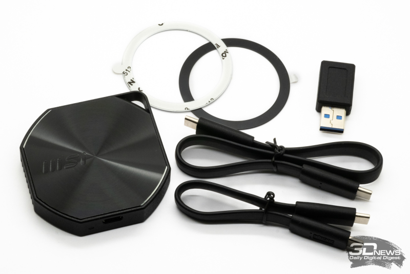 Além disso, a unidade MSI vem com dois anéis de aço revestidos com adesivo em um dos lados. O fato é que ímãs de neodímio são incorporados à base do dispositivo de armazenamento, com a ajuda dos quais ele pode ser fixado a uma superfície com propriedades ferromagnéticas. A MSI sugere que isso permitirá que o SSD seja conectado magneticamente ao laptop ou smartphone ao qual estiver conectado, tornando-o mais conveniente para uso “em tempo real”.