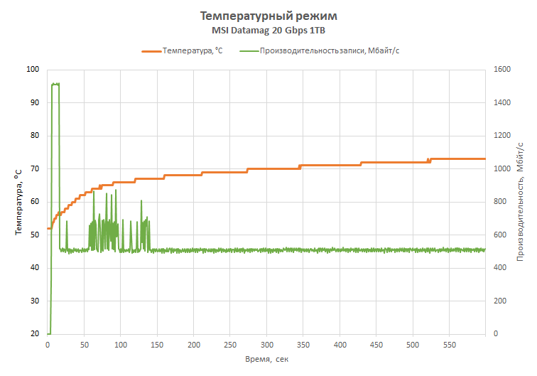 No entanto, os testes mostram que, ao gravar arquivos continuamente no Datamag 20Gbps, a temperatura do controlador aumenta muito rapidamente, chegando a 73 graus em dez minutos. E mesmo em estado de repouso, o controlador está claramente abafado – sua temperatura, se o drive for simplesmente conectado à porta por um longo tempo, oscila em torno de 50 graus.