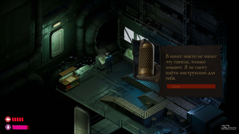 Além disso, o jogo nos limita muito em recursos e, portanto, incentiva a exploração cuidadosa dos locais. Algumas portas (e às vezes escotilhas com caixas) não podem ser abertas sem uma gazua ou pé de cabra, então você deve “aspirar” cada cômodo em busca de materiais e criar ferramentas em uma bancada. Algumas dessas portas não serão necessárias para o enredo, e algumas podem ser abertas de outra maneira – sacrificando a saúde do personagem (ela é reabastecida pela comida encontrada) ou completando uma missão secundária e obtendo a chave. Houve um momento em que, no processo de pesquisa, quebrei a fechadura, cuja chave me foi dada apenas vinte minutos depois. Esses são entretenimentos bônus pelos quais você não receberá nada além de “conquistas”, mas ainda quer gastar tempo com eles – os livros acabaram sendo muito interessantes, há um desejo de descobrir os detalhes de cada mundo fictício .