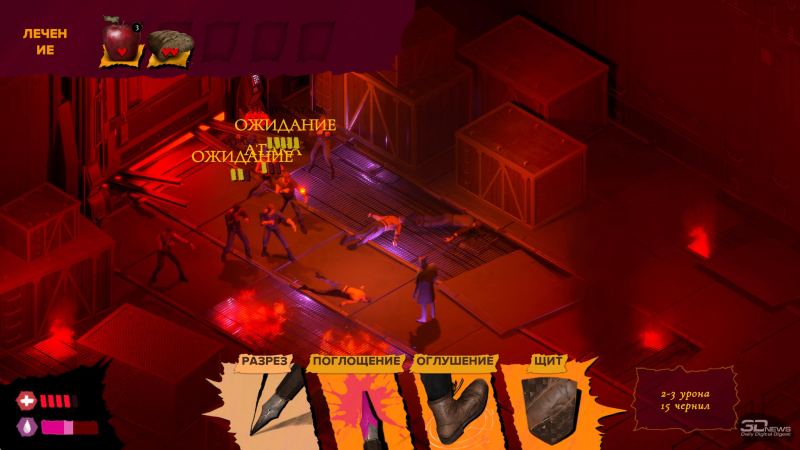 E aqui você tem que interagir com muitas coisas: procurar troféus valiosos nas caixas, resolver quebra-cabeças simples e se comunicar com todos. Isso é algo como uma missão clássica, só que não há necessidade de recorrer às passagens – é difícil se perder. E às vezes o personagem entra em batalha, e algumas batalhas podem ser evitadas se você escolher as respostas certas nos diálogos. As batalhas aqui são baseadas em turnos: primeiro, o protagonista faz um movimento, depois seus oponentes o fazem. Ao mesmo tempo, está escrito acima de suas cabeças o que exatamente farão na próxima vez: atacar, esperar, defender ou curar.