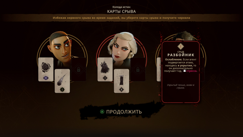 Outra oportunidade de expandir a lista de habilidades são as cartas que você coleta nos níveis. O número de slots para essas cartas é muito limitado, mas alguns deles afetam significativamente o comportamento dos personagens em batalha. Um dos elementos interessantes desse sistema são os cartões vermelhos dados aos heróis caso eles tenham um colapso nervoso durante uma surtida. Ocorre se o herói passou por estresse causado pelas habilidades de alguns inimigos. Os cartões vermelhos fornecem bônus negativos (por exemplo, um agente será capaz de sobreviver a um ferimento mortal duas vezes por nível, não três), mas desaparecem imediatamente após completar a próxima missão sem falhas. Você também pode irritar seus oponentes – se os vilões começarem a ficar estressados, você pode acabar com eles com um botão. Este é outro detalhe ao qual você presta atenção nas batalhas por turnos para completar cada rodada da forma mais eficiente possível.