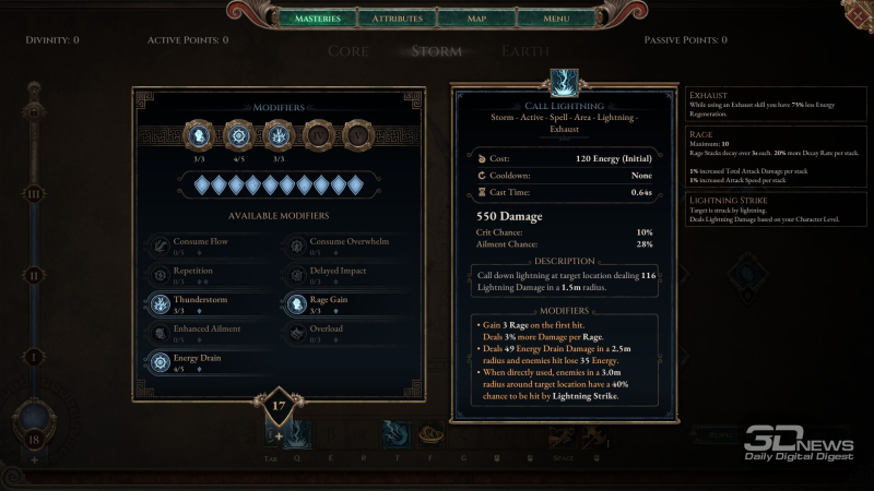 Por exemplo, a arte marcial lhe dará a oportunidade de saltar para o meio dos inimigos, causando dano ao aterrissar; uma vez no epicentro do massacre, será apropriado usar golpes abrangentes, que afastarão perfeitamente a multidão de monstros de toda a “palha”, e para os inimigos mais fortes, um ataque pesado já está preparado, causando 187% do dano da sua arma! Se você não gosta de contatos tão próximos com legiões de monstros míticos, então você deve prestar atenção a uma (ou duas ao mesmo tempo) maestria elemental, que dá acesso a raios, fragmentos de gelo, bolas de magma incandescente e terremotos. E se você prefere uma jogabilidade mais “complicada”, não deixe de experimentar a maestria das sombras, onde você terá acesso a golpes insidiosos nas costas, arremessos de armas, envenenamento, derramamento de sangue e granadas.