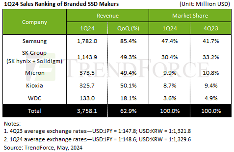 O maior player do mercado global no primeiro trimestre de 2024 foi a Samsung com uma participação de 47,4% e vendas de US$ 1,78 bilhão: o crescimento em relação ao trimestre anterior foi registrado em 85,4%. Em segundo lugar está o Grupo SK (SK hynix e Solidigm), cujas remessas aumentaram trimestralmente em 49,3%, para US$ 1,14 bilhão, e sua participação foi de 30,4%. A Micron fecha os três primeiros com receita de US$ 373,5 milhões (um aumento de 49,4% no trimestre) e uma participação de cerca de 9,9%.