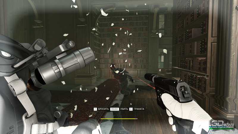 À primeira vista, o que está acontecendo é muito parecido com FEAR Enemies são destacamentos de mercenários sem rosto, conversando ativamente uns com os outros. O herói percorre as salas dos fundos e os escritórios em câmera lenta elegante. Feixes de faíscas se espalham das balas em todas as direções e, de qualquer explosão, uma onda diverge, distorcendo o ar ao redor. Até o equilíbrio é parecido: uma forte propagação ao atirar do quadril, um golpe na cabeça só mata um inimigo pego de surpresa e, em geral, para derrubar o inimigo, é preciso disparar pelo menos metade do pente nele. Completa a imagem, é claro, a capacidade de plantar do pé em um salto – a recepção é mais letal do que qualquer bala.