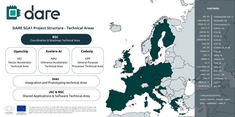 A iniciativa será financiada por 38 participantes, incluindo empresas de TI, institutos de pesquisa e universidades de toda a Europa. O projeto é apoiado pela EuroHPC JU e coordenado pelo Centro de Supercomputação de Barcelona (BSC-CNS). Este último tem ampla experiência no desenvolvimento de chips RISC-V e sistemas de supercomputadores. Metade do investimento no projeto DARE será fornecido pela Comissão Europeia por meio da EuroHPC, e a outra metade virá diretamente de parceiros europeus, incluindo € 34 milhões do Ministério da Ciência, Inovação e Universidades da Espanha.