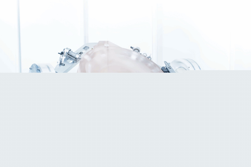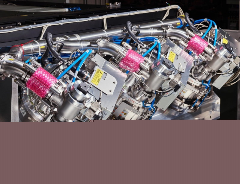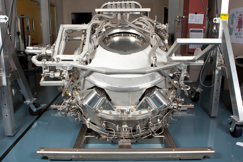 Unidade de geração EUV totalmente montada para máquina litográfica; a vista lateral do coletor primário de radiação é uma tigela prateada logo acima do centro da imagem (fonte: ASML)