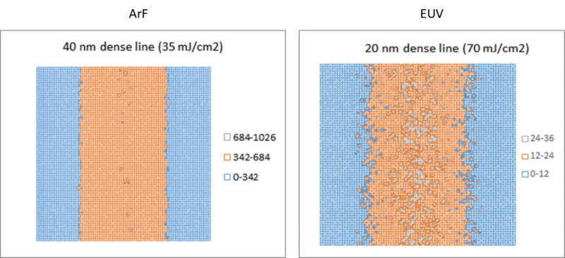 Comparação de linhas formadas na superfície de uma pastilha de silício por um laser ArF com comprimento de onda de 193 nm (esquerda) e radiação EUV de 13,5 nm: a escala da imagem à direita é duas vezes maior. Pode-se observar que com a duplicação da densidade de energia (70 mJ/cm2 para EUV vs. 35 mJ/cm2 para DUV), os efeitos estocásticos tornam-se muito mais pronunciados. As sombras nas figuras refletem diferentes gradações do número de fótons que caem na unidade base de área: 1 nm2 para DUV e 0,25 nm2 para EUV (fonte: SemiWiki)
