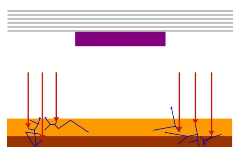 Elétrons secundários gerados na espessura do fotorresistente adicionam estocásticos ao processo de exposição (Fonte: Wikimedia Commons)
