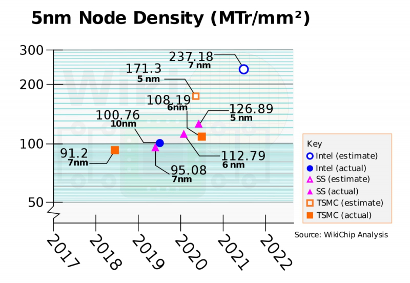 A densidade real de padrões tecnológicos de “5 nm” implementados e/ou planejados para serem implementados essencialmente no mesmo equipamento ASML EUV por diferentes fabricantes de chips, milhões de transistores por 1 sq. mm, em comparação com “7nm” e “10nm”, no final de 2021 (Fonte: WikiChip)