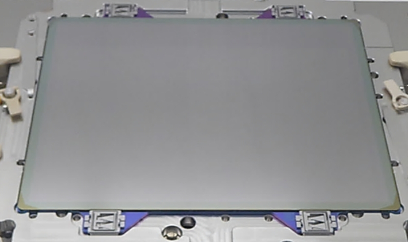 Fotomáscara reflexiva (retângulo cinza escuro logo acima do centro da imagem) montada em um suporte dentro da litografia EUV (fonte: MIT)