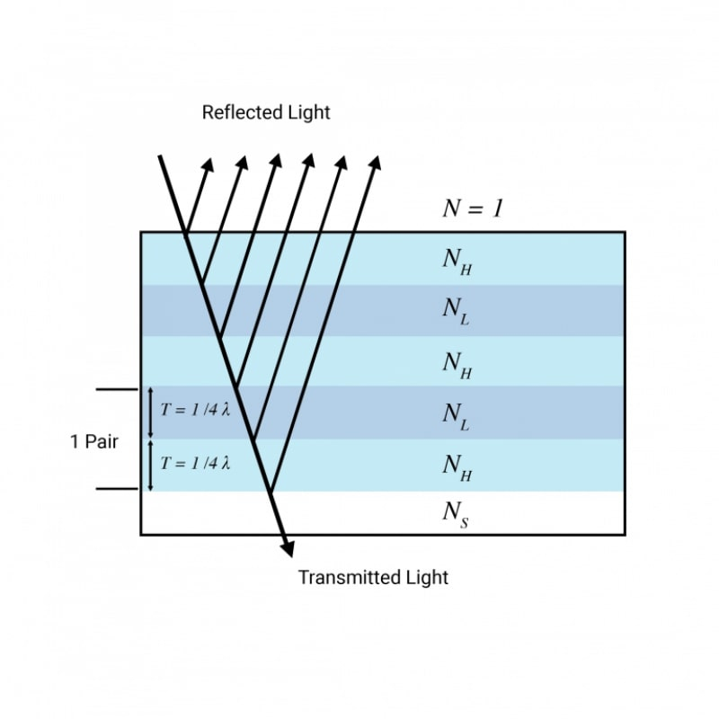 O princípio de funcionamento de um espelho Bragg de película fina de camadas alternadas com altos e baixos índices de refração de um quarto de comprimento de onda cada (fonte: Manx Precision Optics)