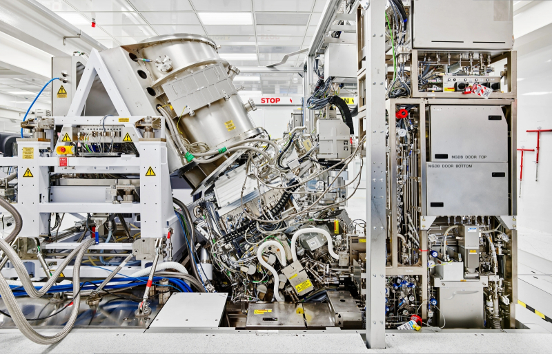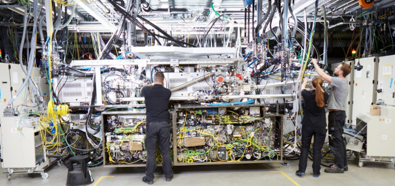 Um componente importante, volumoso, mas ainda não o mais difícil de fabricar em uma máquina EUV – uma fonte de radiação de 13,5 nm – em uma sala de montagem “limpa” na ASML (fonte: MIT)