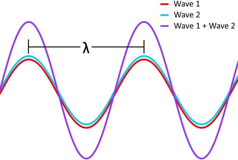 Não há nada mais simples do que a interferência construtiva: duas ondas que estão em fase se somam – e se reforçam mutuamente (fonte: Angstrom Engineering)