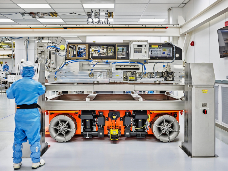 Os fragmentos da planta EUV são tão grandes que um robô especial com rodas da KUKA Robotics é usado para movê-los pela sala de montagem “limpa” em ASML (fonte: MIT)