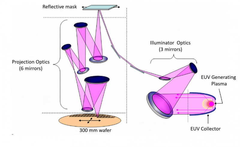 O caminho óptico da fotolitografia EUV mais simples inclui um gerador de plasma com um coletor de sua radiação primária (canto inferior direito), um braço de iluminação da fotomáscara de três espelhos, a própria fotomáscara (também reflexiva) e um braço de projeção de 6 espelhos que redireciona a luz para uma placa de peça coberta com fotorresistente (fonte: SPIE)