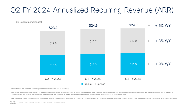 A receita de produtos de rede foi de US$ 7,08 bilhões, um pouco abaixo do consenso de US$ 7,10 bilhões dos analistas consultados pela StreetAccount e uma queda de 12% em relação ao ano passado. A divisão de Segurança recebeu receita de US$ 973 milhões (um aumento de 3%), a divisão de Colaboração – US$ 989 milhões (um aumento de 3%), Observabilidade – US$ 188 milhões (um aumento de 16%). As vendas da empresa caíram 4% nas Américas, 7% na Europa, Oriente Médio e África, e 12% na Ásia-Pacífico, Japão e China. Os pedidos de produtos caíram 12% em relação ao ano anterior, disseram executivos da Cisco.