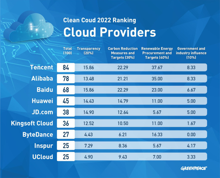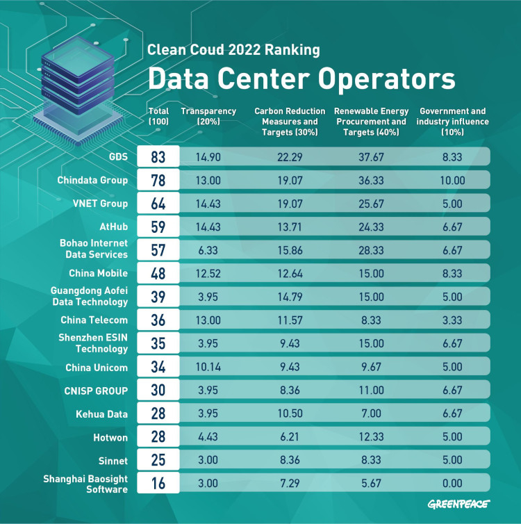 No ranking do Greenpeace East Asia 2022 entre operadoras de data centers, a GDS ocupa o primeiro lugar em termos de sustentabilidade ambiental, mas mesmo essa empresa está longe de gigantes da tecnologia ocidentais como o Google, que declaram 100% de uso de energia renovável (talvez estejamos falando de a chamada “camuflagem verde”, em teoria permitindo “no papel” usar mais de 100% dessa energia). O proprietário do TikTok é o terceiro maior provedor de nuvem, atrás apenas da Tencent, Alibaba e Baidu e outras empresas. Este é o terceiro ranking anual do Greenpeace dedicado a empresas chinesas de nuvem e data centers.