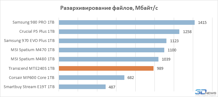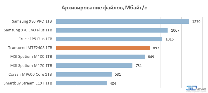 A velocidade de gravação relativamente baixa encontrada no Transcend MTE240S deixa sua marca nos resultados dos testes de arquivos. Ao copiar e descompactar arquivos dentro da unidade, o MTE240S é inferior à maioria dos SSDs com controladores de oito canais. No entanto, no caso de arquivamento, quando as operações de leitura prevalecem sobre as operações de gravação, seu resultado acaba sendo melhor – a unidade Transend supera as soluções construídas em controladores Phison.