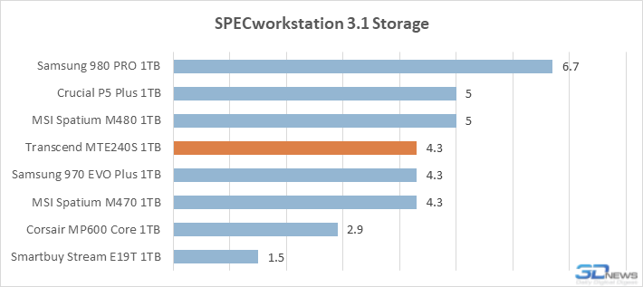 Os números de desempenho obtidos nos vários cenários incluídos no SPECworkstation repetem o quadro geral. Em outras palavras, o Transcend MTE240S é bastante adequado para sistemas de trabalho de nível médio. Seu desempenho não é recorde, mas significativamente superior ao de drives com controladores sem buffer ou baseados em QLC 3D NAND.