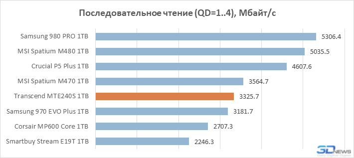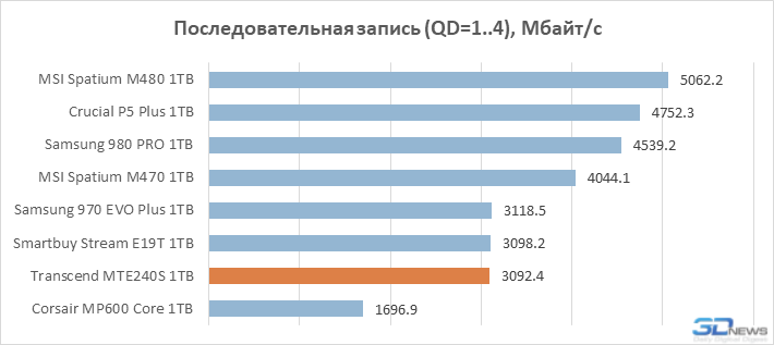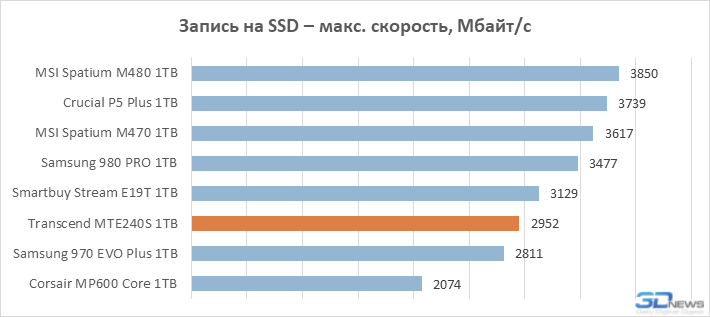 Embora o Transcend MTE240S seja anunciado para suportar a interface PCIe 4.0 x4, ele não é capaz de competir com os principais drives do nível Samsung 980 PRO e WD Black SN850 devido ao design de quatro canais. Um array flash de quatro canais, composto por dispositivos com frequência de 1200 MHz, nem teoricamente é capaz de bombear quatro pistas PCIe 4.0 com largura de banda máxima de 7,9 GB / s. Portanto, as características do passaporte do MTE240S são mais semelhantes às características de um drive com interface PCIe 3.0, pelo menos em termos de velocidades lineares.