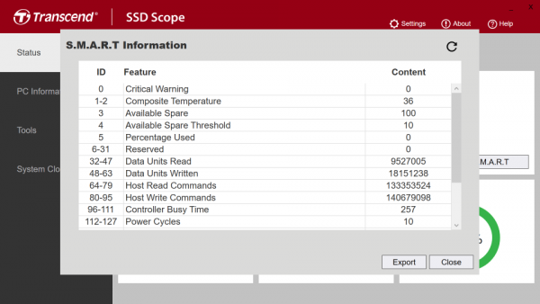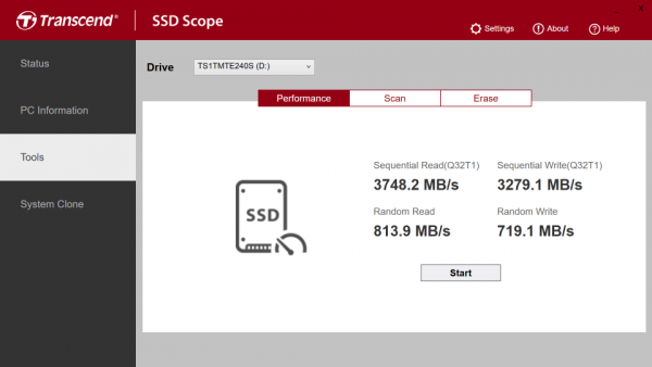 Para atender suas próprias unidades, a Transcend lançou um utilitário especial SSD Scope. Seus recursos são quase típicos para produtos de software dessa classe, no entanto, algumas das funções usuais não são suportadas por algum motivo.