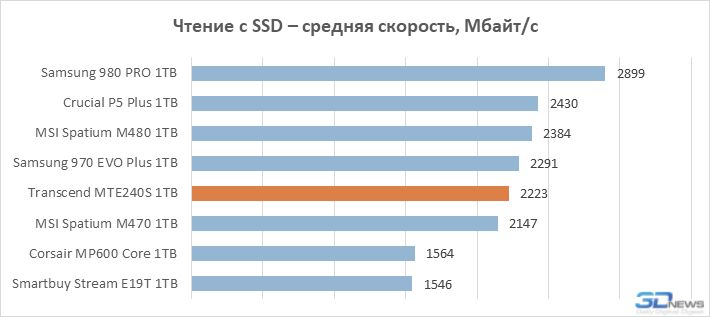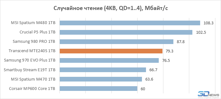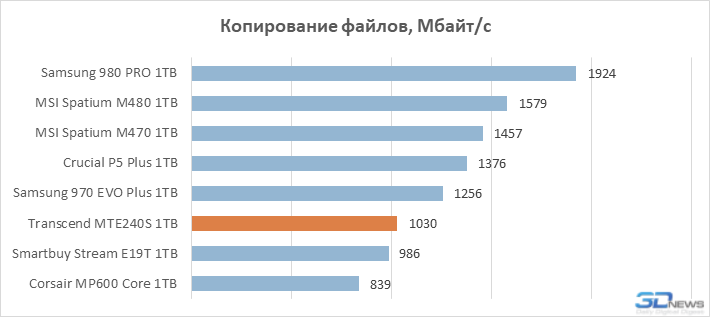 Ao mesmo tempo, a baixa velocidade do array de memória flash Transcend MTE240S não chama a atenção durante a leitura de arquivos. Não está entre os líderes em termos de velocidade de leitura, mas também não há um atraso radical em relação aos SSDs com controladores de oito canais. Em outras palavras, reduzir o número de canais do controlador para reduzir o custo de um SSD prejudica as características de desempenho apenas seletivamente.