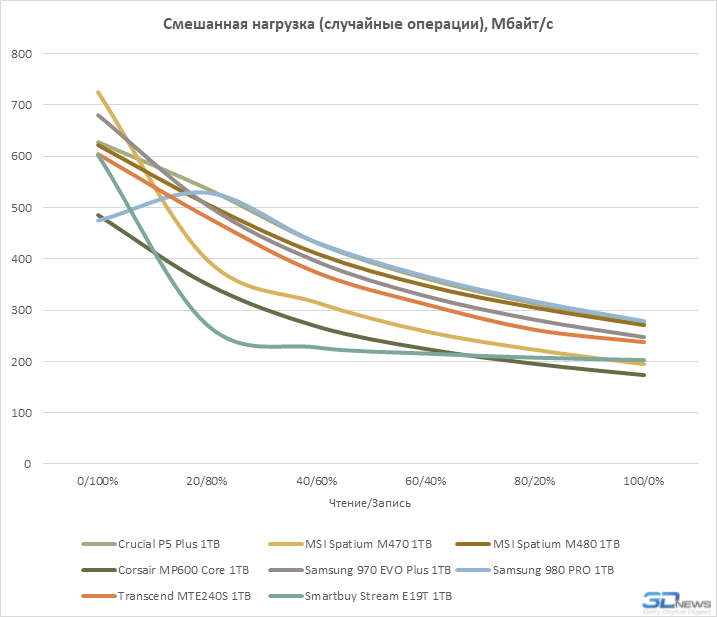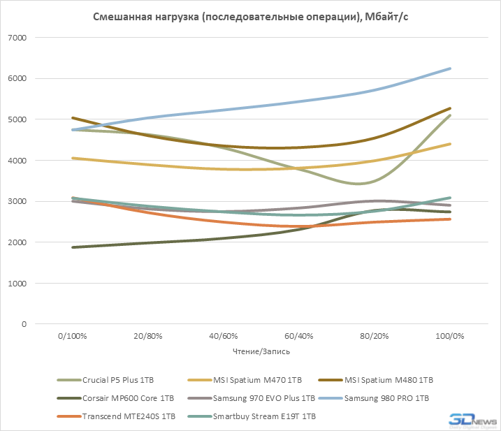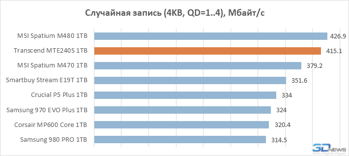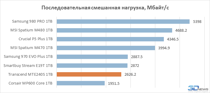 Em operações sequenciais, o principal fator que determina o desempenho de um SSD é a velocidade do array flash. Portanto, o Transcend MTE240S, que usa uma matriz de quatro canais que não é o mais rápido dos dispositivos NAND TLC 3D de 96 camadas, não parece muito confiante em testes desse tipo. Além disso, em alguns casos, ele perde até para a unidade sem buffer Smartbuy Stream E19T, cujos resultados são maiores devido ao uso de uma memória flash de 176 camadas mais recente.