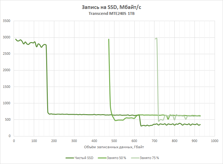 No entanto, em um SSD parcialmente ocupado por dados, a gravação acelerada quase não funciona. O MTE240S, já ocupado por 50 ou 75% dos arquivos, é capaz de gravar apenas 10-12 GB de dados em modo acelerado, o que significa uma eficiência bastante baixa do algoritmo de cache SLC dinâmico.