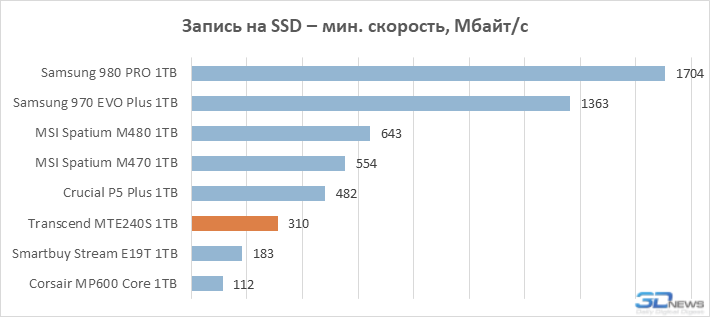 Os indicadores de velocidade em si também não parecem muito impressionantes. As gravações aceleradas de bit único são executadas a uma velocidade de 2,9 GB / s, que é notavelmente menor que a velocidade do cache SLC em unidades com controladores de oito canais. A velocidade mínima de gravação no modo TLC também não parece importante: abaixo do MTE240S no diagrama correspondente, apenas os resultados dos SSDs com a arquitetura mais econômica estão localizados – seja com memória QLC ou em controladores sem buffer.