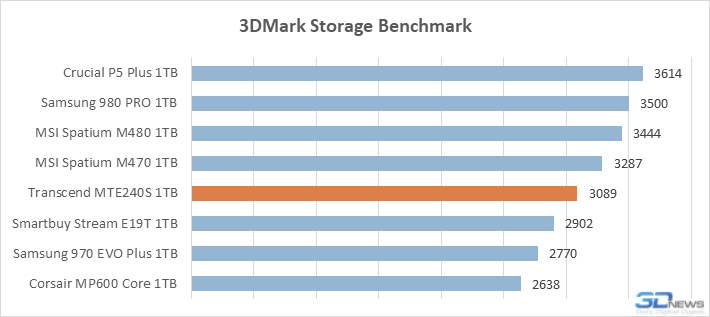 Ao mesmo tempo, em termos de desempenho em jogos, o considerado Transcend MTE240S acaba sendo claramente pior do que qualquer unidade PCIe 4.0 com controladores de oito canais. Isso se traduz em seu atraso perceptível mesmo em soluções baseadas no chip Phison PS5016-E16, que custam pelo menos não mais. Ou seja, no caso de sistemas de jogos, o MTE240S dificilmente pode ser chamado de escolha racional. No entanto, para ser justo, deve-se notar que o 3DMark Storage é outro teste que mostra a superioridade do Transcend MTE240S sobre o ex-campeão Samsung 970 EVO Plus.