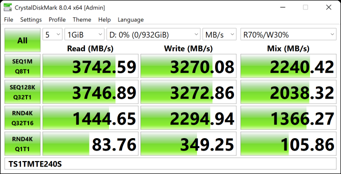 A medição das velocidades de pico no teste CrystalDiskMark confirma totalmente os números declarados pelo fabricante. A velocidade máxima de linha que o MTE240S pode fornecer é de apenas 3,75 GB/s, que é apenas 5% maior do que as velocidades de linha fornecidas por SSDs PCIe 3.0 de alta qualidade.