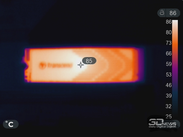 Vale acrescentar que a temperatura que o Transcend MTE240S retorna pela SMART está bem próxima da realidade, e isso tem sido uma raridade recentemente. A imagem térmica confirma que a temperatura máxima do dissipador de calor de grafeno observada pelo dispositivo corresponde às leituras de telemetria.