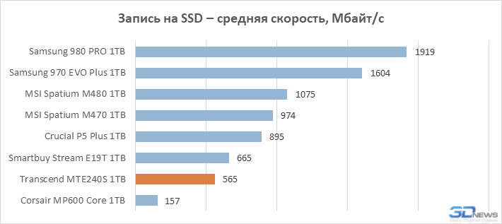 O Transcend MTE240S não afirma ser a unidade principal inicialmente. Ele é baseado em um controlador de quatro canais mais barato, então o fabricante o apresenta como um SSD PCIe 4.0 despretensioso, mas de alta qualidade para o usuário em massa. E seu desempenho é bastante consistente com esse posicionamento – o MTE240S é obviamente mais lento que o Samsung 980 PRO e o WD Black SN850, mas pode ser equiparado com segurança a vários modelos PCIe 4.0 baseados na plataforma Phison E16. Além do controlador simplificado, não há falhas significativas no design do MTE240S: ele é baseado em boa memória TLC e é equipado com um buffer DRAM espaçoso e, portanto, oferece um desempenho médio confiável em jogos e aplicativos.
