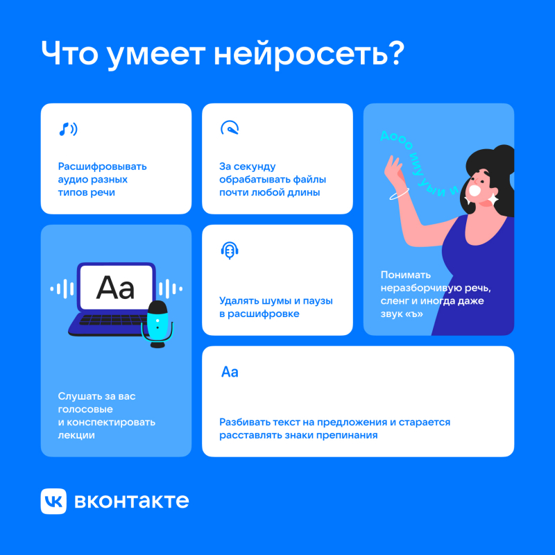 Para reconhecimento, você pode escolher um dos dois modelos. Neutro é bom para fala inteligível, como em um programa de TV ou entrevista, enquanto o espontâneo ajudará quando você precisar processar uma fala mais casual com gírias e palavrões. As redes neurais VKontakte são capazes de remover ruídos e pausas da decodificação, entender a fala ininteligível.