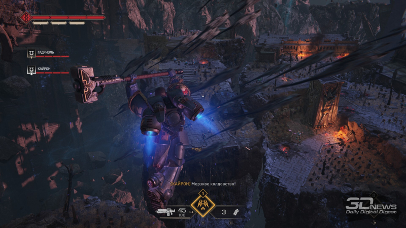 E para evitar que batalhas grandiosas se tornem chatas, os desenvolvedores fornecem prudentemente novos tipos de armas, lâminas e martelos ao longo da história. E na jogabilidade existem elementos projetados para adicionar variedade à sangrenta ópera espacial. Por exemplo, segmentos com jetpacks mudam a própria abordagem das batalhas, tornando os volumosos Space Marines muito mais manobráveis e móveis (e abrindo oportunidades para ataques espetaculares vindos de cima). Às vezes, o tiroteio e o massacre são salpicados de cenas em que você precisa proteger certos objetos no mapa ou abrir caminho por catacumbas escuras repletas de pequenas criaturas mortais, com as quais você só pode lidar mantendo o dedo no gatilho do lança-chamas. Às vezes a ação é diluída por brigas com chefes ou pelo surgimento de um novo lado no conflito…