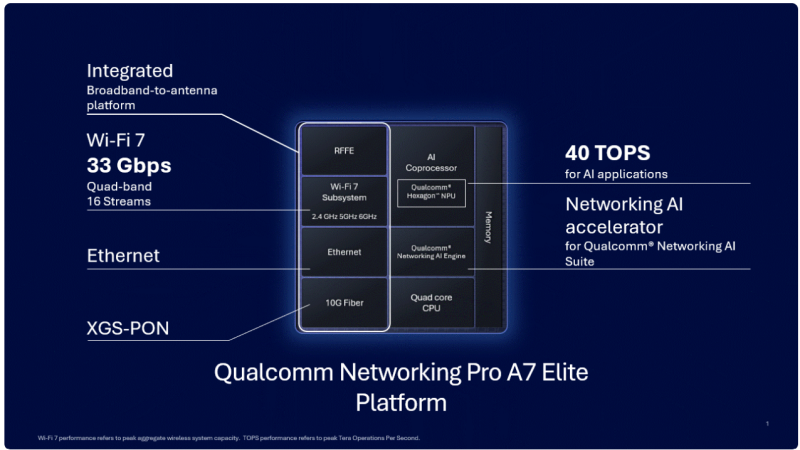 A Qualcomm anunciou o lançamento da nova plataforma de rede sem fio multifuncional Pro A7 Elite com suporte para o padrão sem fio Wi-Fi 7 (802.11be) e XGS-PON. A plataforma foi projetada para ser implantada na borda e está equipada com uma ampla gama de recursos de rede de última geração, complementados por funções de IA.